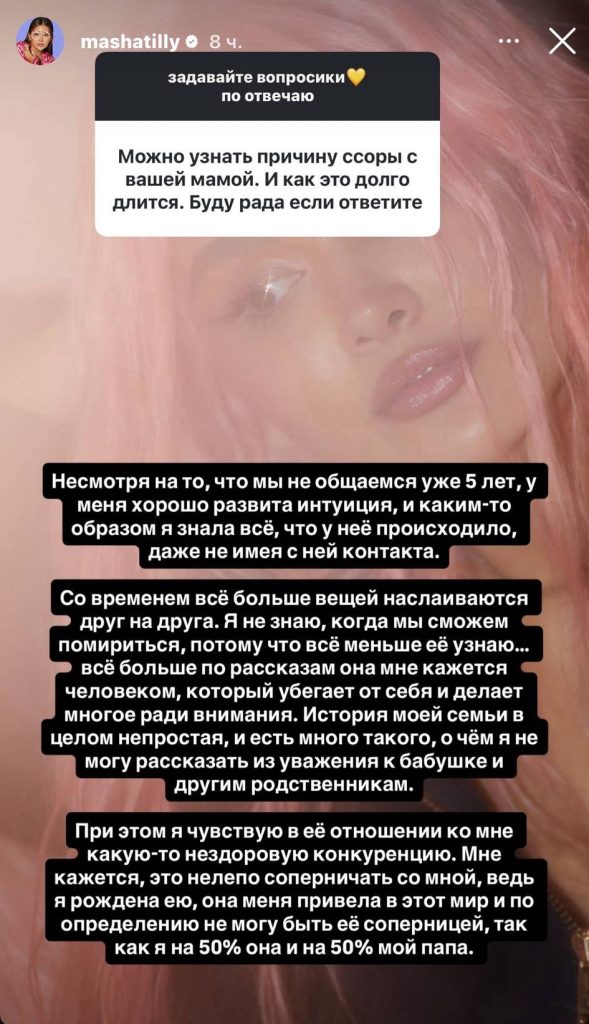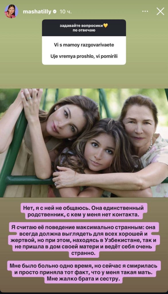 O‘zbekiston Birinchi Prezidentining nabirasi va mashhur blogger Maryam Tillayeva Instagram’da obunachilarining savollariga javob berdi. Albatta, eng ko‘p qiziqish uyg‘otgan mavzulardan biri onasi Lola Tillayeva bilan munosabatlari bo‘ldi.